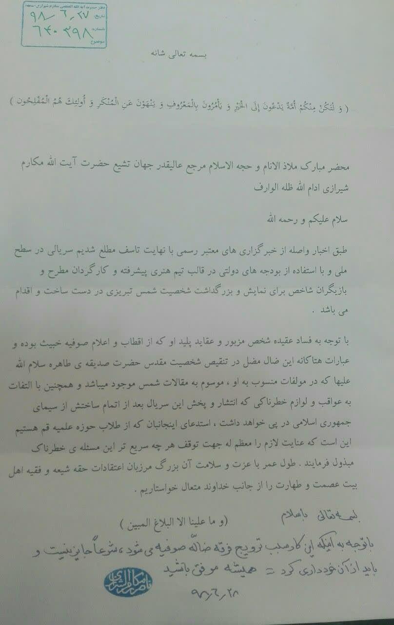 با توجه به فساد عقیده شخص مزبور و عقاید پلید او که از اقطاب و اعلام صوفیه بوده و عبارات هتاکانه در تنقیص شخصیت مقدس حضرت صدیقه طاهره (سلام الله علیها) که در مؤلفات منسوب به او، موسوم به مقالات شمس موجود می باشد و همچنین با التفات به عواقب و لوازم خطرناکی که انتشار و پخش این سریال بعد از اتمام ساختش از سیمای جمهوری اسلامی در پی خواهد داشت، استدعای اینجانبان که از طلاب حوزه علمیه قم هستیم این است که عنایت لازم را معظمله جهت توقف هرچه سریعتر این مسئلهی خطرناک مبذول فرمایند.