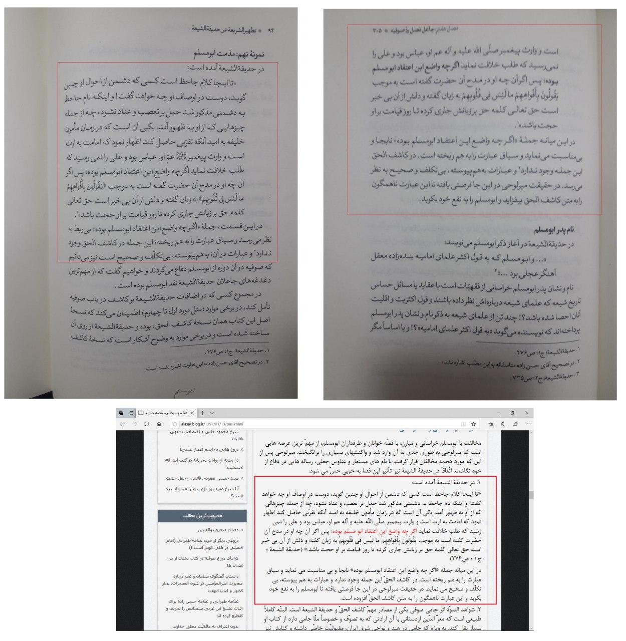 صد افسوس که وی در مواضع متعددی ناآگاهی خود از مصادر وبلاگ الآثار را نیز با برخی از تغییرات مفتضح جزئی که با مصدر ناهمخوان است، نشان داده است. و حتی برخی از اغلاط ویرایشی و گاه کلمه ای وبلاگ در نقل از منابع را نیز اصلاح نکرده است.