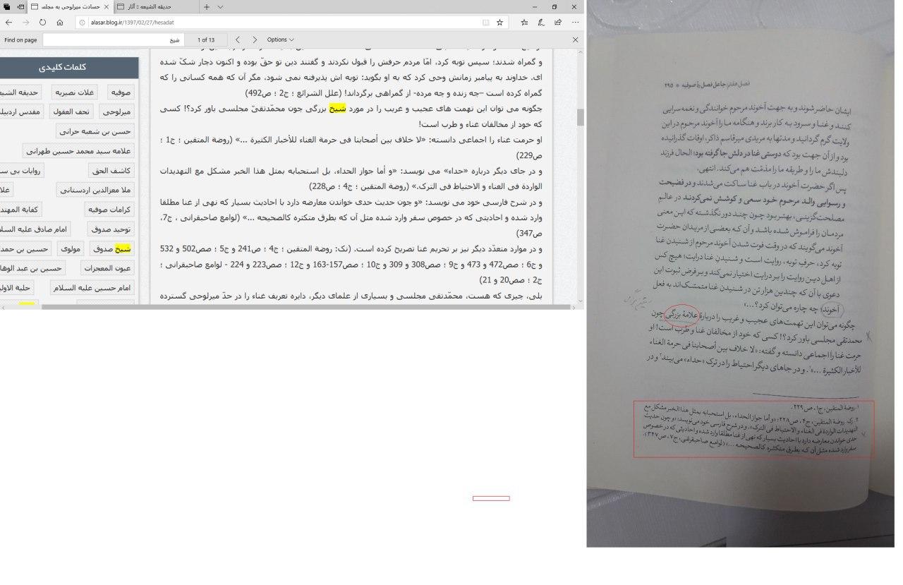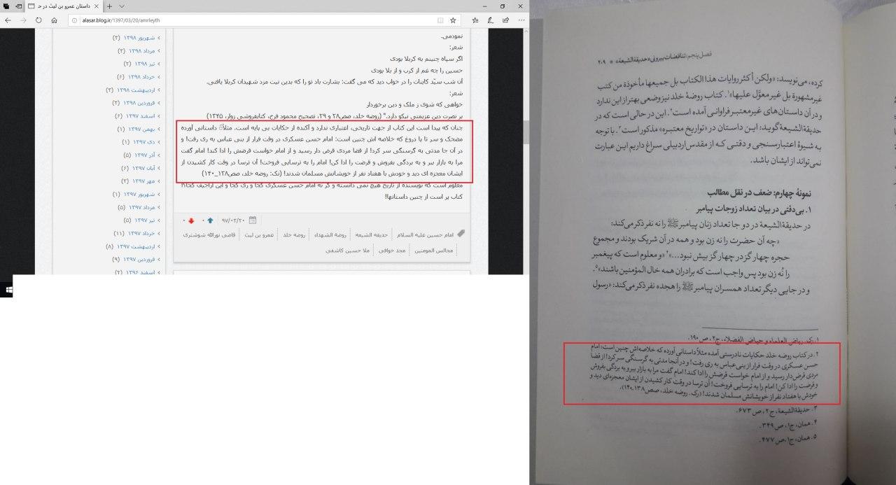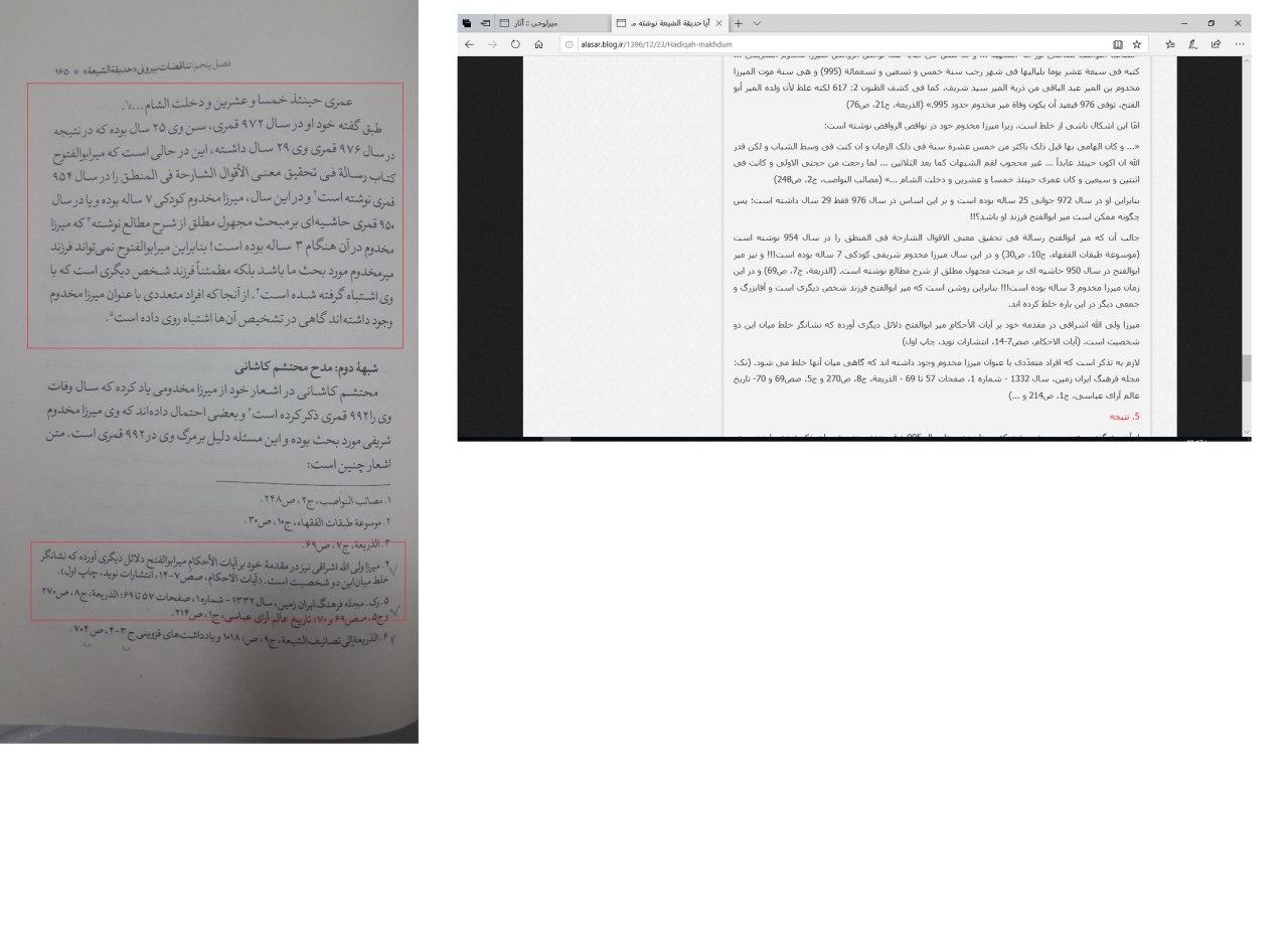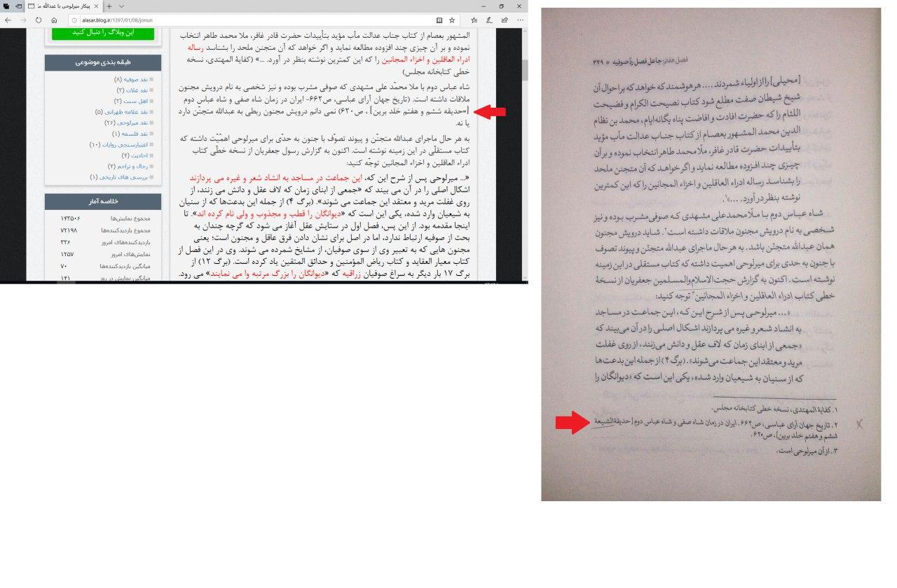 خوشمزّه آن که در وبلاگ آثار به حدیقهی ششم و هفتم از روضه هشتمِ خلد برین ارجاع داده شده است. اما از آن جا که آقای وکیلی اطلاعی از این کتاب نداشته، آن را با حدیقه الشیعه اشتباه گرفته و عملا ارجاع وبلاگ را به «حدیقه الشیعه ششم و هفتم خلد برین» تحریف کرده است!! http://alasar.blog.ir/1397/01/08/jonun