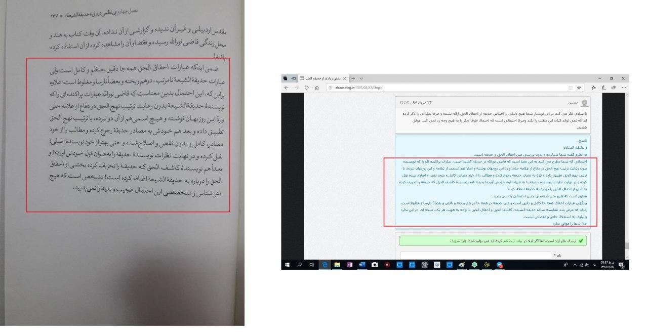 در متن مرآه الحقّ نیز جز «اظهار تعجّب و غرابت» هیچ چیز دیگری به میرزای قمی نسبت داده نشده است؛ نه تصدیق وحدت وجودی بودن مقدّس اردبیلی و نه نفی حدیقه الشیعه از او! به راستی این سطح دقّت آقای وکیلی، با تحقیقات دقیقی که به خود بسته اند، تناسب دارد؟!