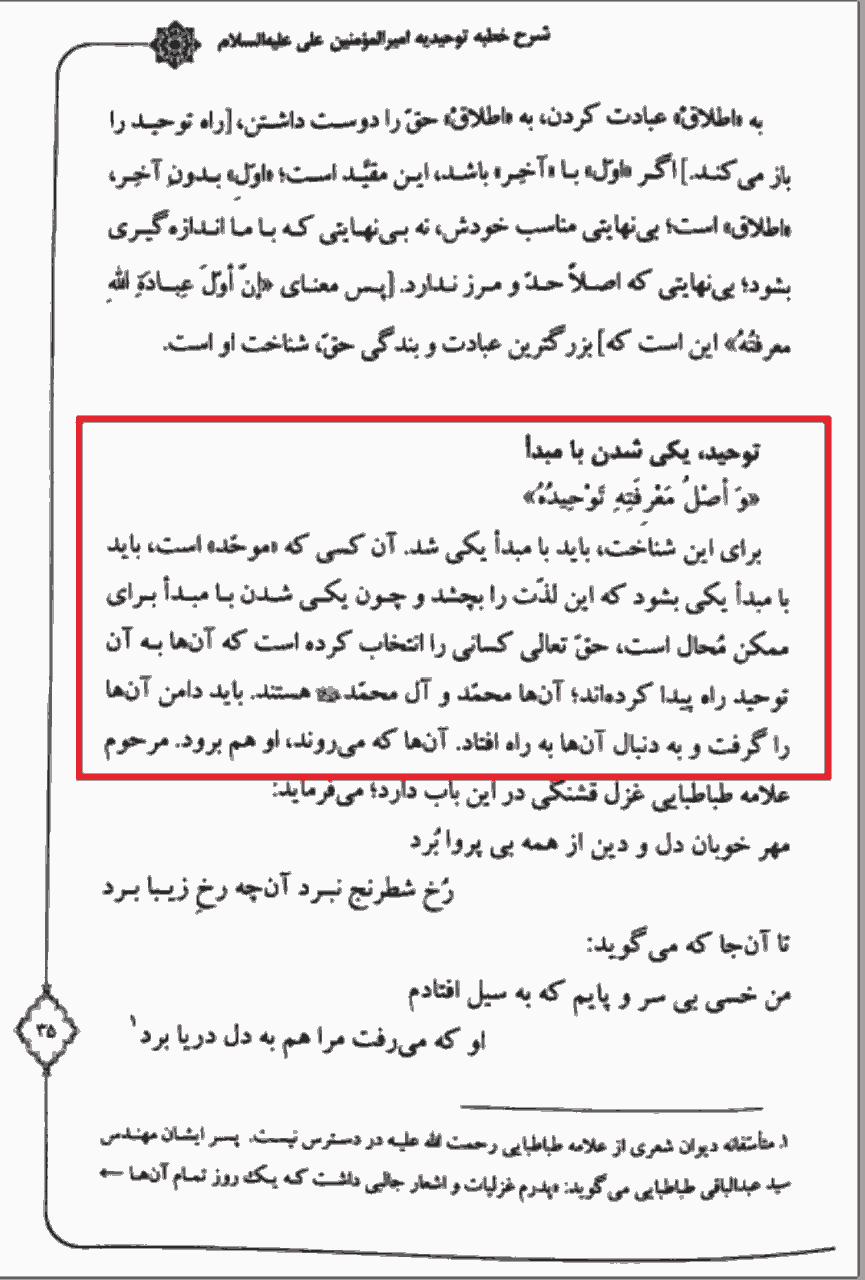 «شناخت خدا همان توحید است. لذا برای این شناخت باید با مبدأ یکی شد. مُوَحد باید با مبدأ یکی شود و چون یکی شدن با مبدأ برای ممکن محال است، خدا اهل بیت علیهم السلام را جلو انداخته که دنبال آنها برویم و به توحید واقعی برسیم. معنای توحید در خطبه نورانی امیرالمومنین علیه السلام این نیست که انسان قائل به یکی بودن خدا باشد. این یکی از پایینترین مراتب توحید است. کمال توحید این است که مُوَحد با مبدا یه یگانگی مطلق برسد. ️خدا درباره خودش میفرماید: هو الاول و الاخر و الظاهر و الباطن. امیرالمومنین علیه السلام نیز میفرماید: انا الاول و الاخر و الظاهر و الباطن! لذا حضرت با مبدأ یکی شده. هر معنایی که برای اول و آخر خدا قائلیم، برای آنحضرت نیز قائلیم. چون ایشان به توحید واقعی یعنی توحید ذاتی رسیده. در شأن ایشان آمده: إن علیا ممسوس فی ذات الله. در نهج البلاغه نیز فرموده: فانا صنایع ربنا و الناس بعد صنائعنا. به همین جهت انالاول میگوید. حالا از این معرفت یک برقی جهیده و سینه عارفی را روشن کرده و گفته: سبحانی، سبحانی، ما اعظم شأنی.»[1]