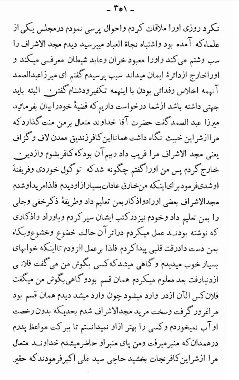 مرا رَفیقی بود در خوی (آذربایجان غربی) بنام “عبدالصّمد” و کراماتی از او ظاهر میشد و مریدِ “مَجد الأشراف شیرازی” قطبِ سلسلۀ ذهبیه شده بود. پس مدّتی دیگر چیزی از کرامات از او بُروز نکرد و در مجامع دیده نشد. روزی او را ملاقات کردم در مجلس یکی از علماء، که آمده بود مسأله ای از “نَجات العِباد” (رسالۀ عملیّۀ صاحِب جواهر) میپرسید. دیدم مجدالاشراف را بد میگوید و او را معبود خَران و عابدِ شیطان معرّفی میکند! و او را خارج از ایمان میداند. سبب پرسیدم که: آنهمه اخلاص و فداکاری کجا، این تکفیر و دشنام کجا، باید سببی داشته باشد! درخواست دارم بیان کنی؟!