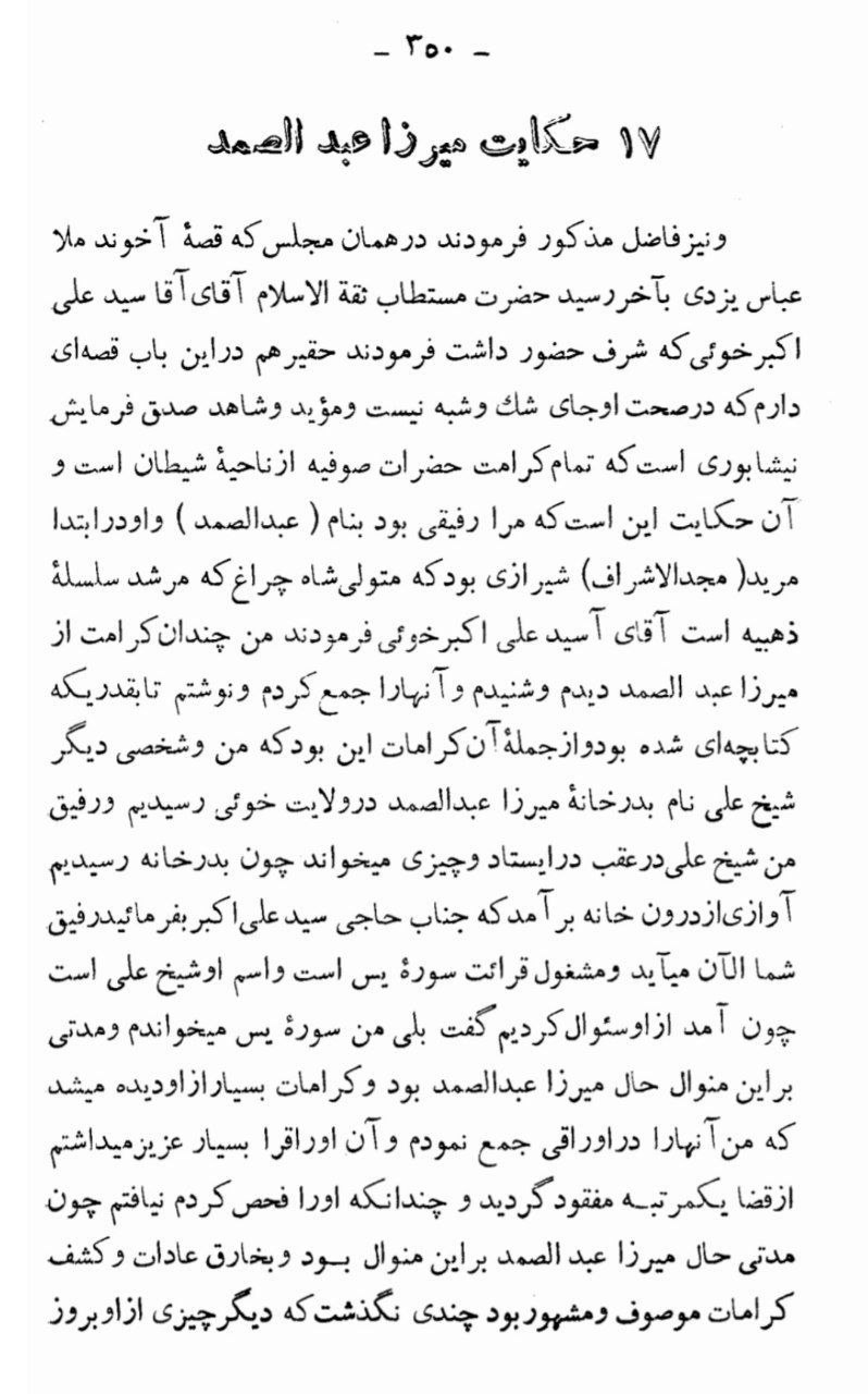 مرا رَفیقی بود در خوی (آذربایجان غربی) بنام “عبدالصّمد” و کراماتی از او ظاهر میشد و مریدِ “مَجد الأشراف شیرازی” قطبِ سلسلۀ ذهبیه شده بود. پس مدّتی دیگر چیزی از کرامات از او بُروز نکرد و در مجامع دیده نشد. روزی او را ملاقات کردم در مجلس یکی از علماء، که آمده بود مسأله ای از “نَجات العِباد” (رسالۀ عملیّۀ صاحِب جواهر) میپرسید. دیدم مجدالاشراف را بد میگوید و او را معبود خَران و عابدِ شیطان معرّفی میکند! و او را خارج از ایمان میداند. سبب پرسیدم که: آنهمه اخلاص و فداکاری کجا، این تکفیر و دشنام کجا، باید سببی داشته باشد! درخواست دارم بیان کنی؟!