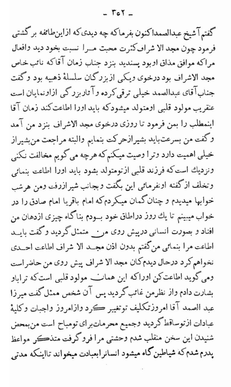 “زمان آقا” این مطلب را بمن خبر داد تا روزی در خوی، مجدالاشراف بنزد من آمد و گفت: من بسرعت باید بروم شیراز، و رفتن من اهمیت دارد؛ و تو را وصیّت میکنم که هرچه میگویم مخالفت نکنی؛ و نزدیک است “فرزند قلبی” از تو متولد شود؛ باید او را اطاعت نمائی و تخلّف نکنی از گفتۀ او! این را بگفت و بجانب شیراز رفت و من هرشب خوابها میدیدم و چنان گمان میکردم که امام محمّد باقر و یا امام صادق علیهما السلام را در خواب میبینم.[1]