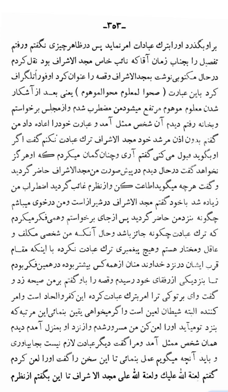 پس از جای برخاستم و همی فکر میکردم که ترک عبادت چگونه جایز باشد؟! و حال آنکه، من شخص مکلّف و عاقل و مختار هستم! و هیچ پیغمبری و هیچ امامی ترک عبادت نکرده! با آنکه مقام قرب ایشان در نزد خدا از همه کس بیشتر بوده! در همین فکر بودم تا نزدِ یکی از رفقاءِ خود رسیدم و قصه را به او گفتم. بر من فریاد زد و گفت: وای بر تو! چه کسی ترا امر بترک عبادت کرده؟! این کفر و اِلحاد است؛ و امرکننده البته شیطان است! اگر میخواهی یقین کنی، این مرتبه که نزد تو آمد او را “لعن” کن! من مسرور شدم و از نزد او بمنزل آمدم، دیدم همان شخص آمد و مرا گفت: دیگر عبادت لازم نیست! و باید آنچه میگویم عمل کنی.