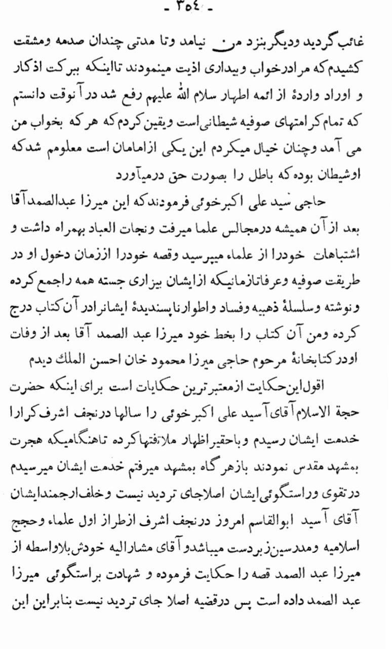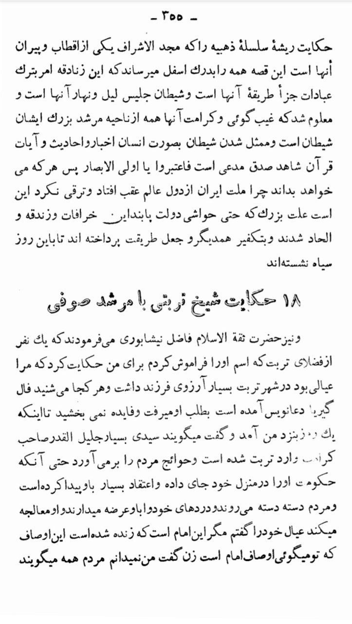 تا این سخن گفت، او را لعنت کردم و گفتم: «لعنة اللهِ عَلیکَ و عَلیَ مَجدِالأشرافِ!» تا این گفتم، از نظرم غایب گردید و دیگر نیامد و تا مدّتی چندان صدمه و مَشَقّت کشیدم که مرا در خواب و بیداری اذیّت مینمود؛ تا آنکه به برکت اذکار وارده مأثوره و معتبرۀ ائمّه اطهار علیهِمُ السّلام رفع شد. آنوقت دانستم که کرامتهای صوفیّه شیطانی است.»