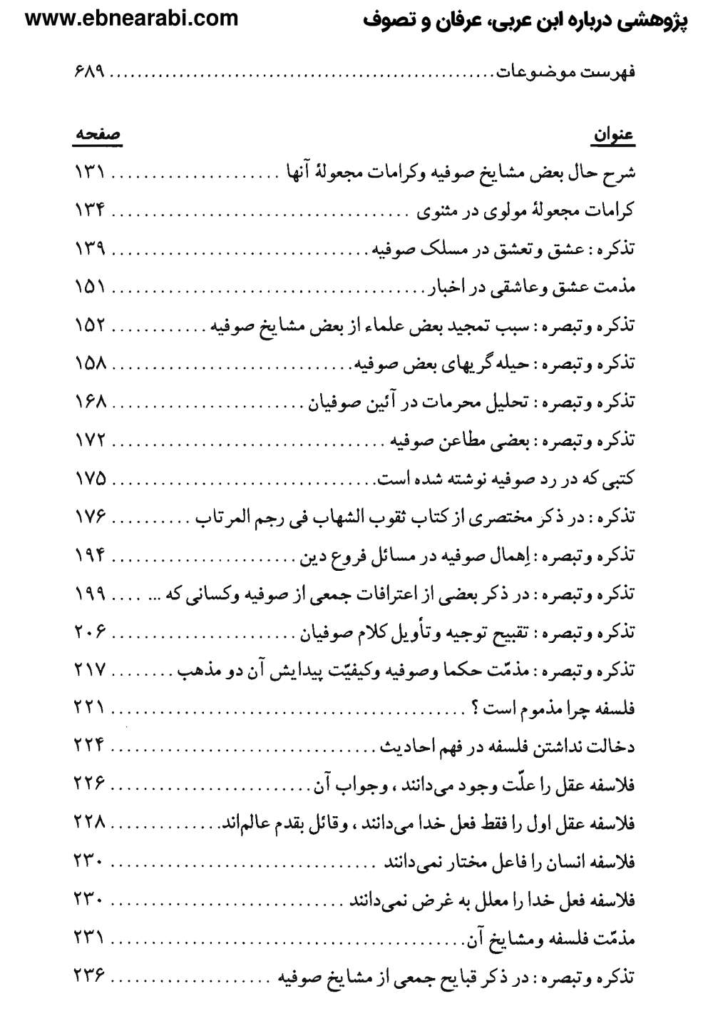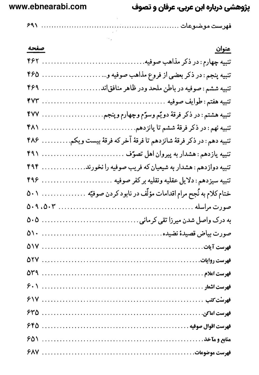 آقا محمدعلی بهبهانی در بخشی از این کتاب، صوفیه را از نگاه اهل سنت بررسی کرده [4] و با استناد و استنباط از روایات اهل بیت(علیهم السلام) و آثار برخی بزرگان همچون مقدس اردبیلی، گمراه بودن صوفیان را اثبات می کند .[5]