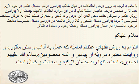 نظراً لظهور بعض الاختلافات بين الطلاب حول بعض المسائل العلميّة، رأينا من اللازم أن نستفتي من مقام المرجع العالي لهذه المسائل المختلف فيها، وهي:
