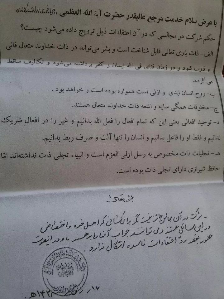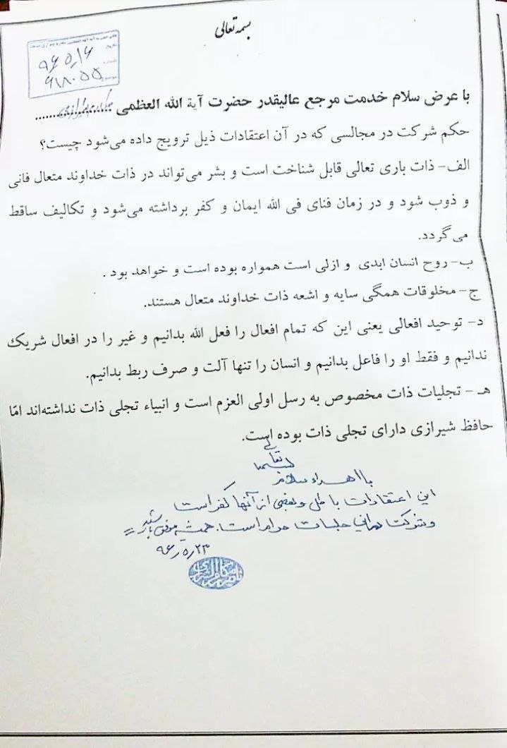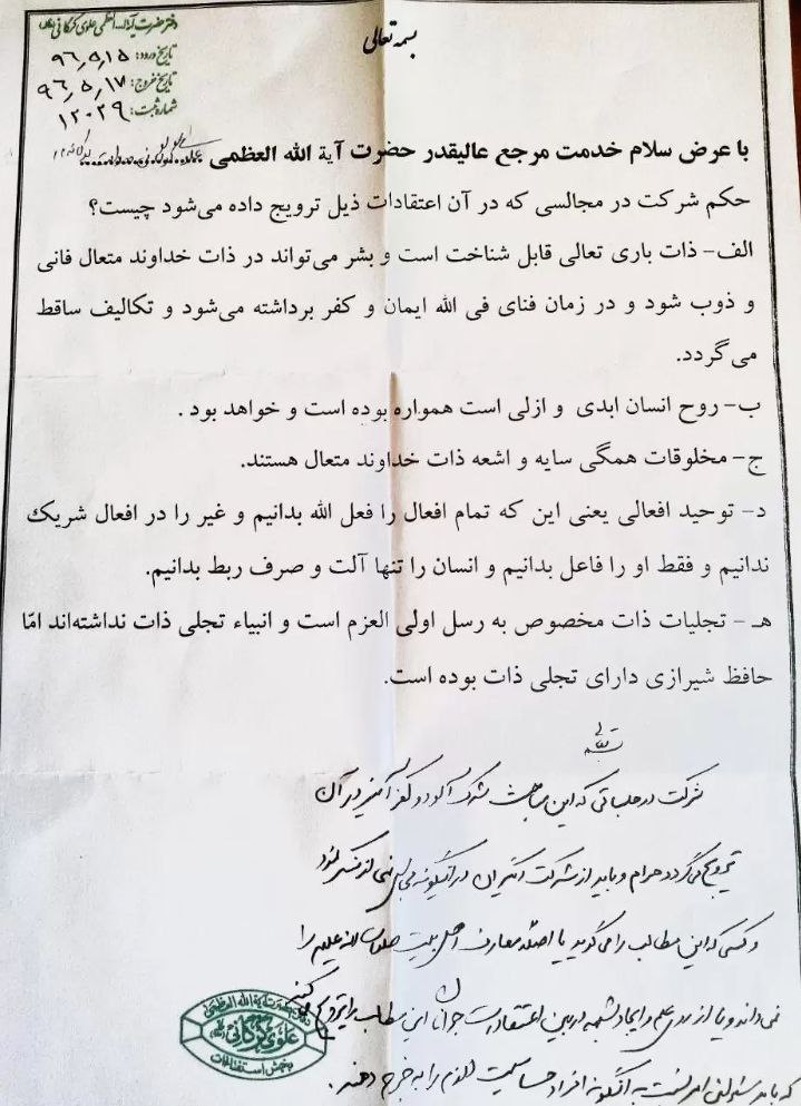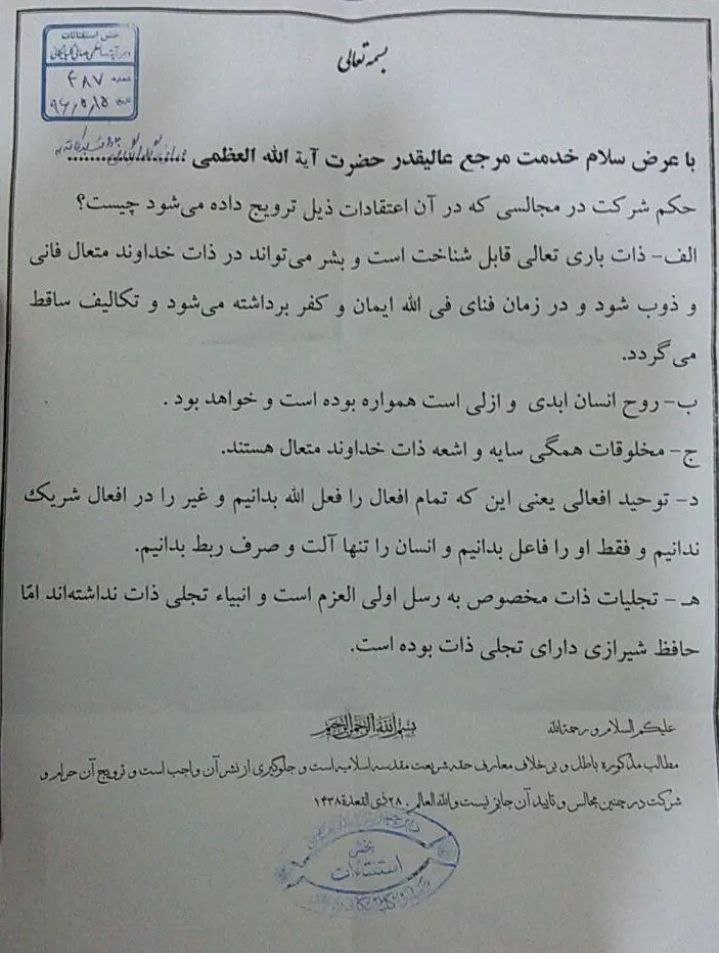 ایسی محفلوں میں شرکت حرام ہے جہاں ان شرکیہ اور کفریہ نظریات کو فروغ دیا جاتا ہو۔ دوسروں کو بھی ایسی محفلوں میں شرکت سے روکنا چاہئے۔ جو بھی یہ باتیں کہتا ہے یا تو اسے اہل بیت علیہم السلام کی تعلیمات کا بالکل بھی علم نہیں ہے یا وہ جان بوجھ کر نوجوانوں کے عقائد میں شبہات پیدا کرنے کے لیے ایسی باتیں کر رہا ہے۔ ذمہ دار افراد کو ایسے لوگوں کے بارے میں حساسیت کا مظاہرہ کرنا چاہئے۔