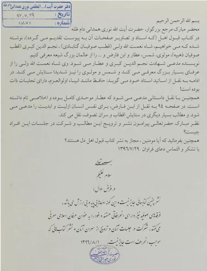 جن باتوں کا سوال میں ذکر آیا ہے ایسی کتابوں کی اشاعت جائز نہیں اور ایسے دعوے بے بنیاد اور بے قیمت ہیں۔ صوفیوں کے گروہ انحرافات کا شکار ہیں۔ وہ خود کو اسلامی عرفان کے لبادے میں پیش کرتے ہیں۔ ان کے جلسوں میں شرکت کرنا، ان کے بڑوں کی تشہیر کرنا اور انحراف کا باعث بننے والی کتابوں کی اشاعت جائز نہیں۔